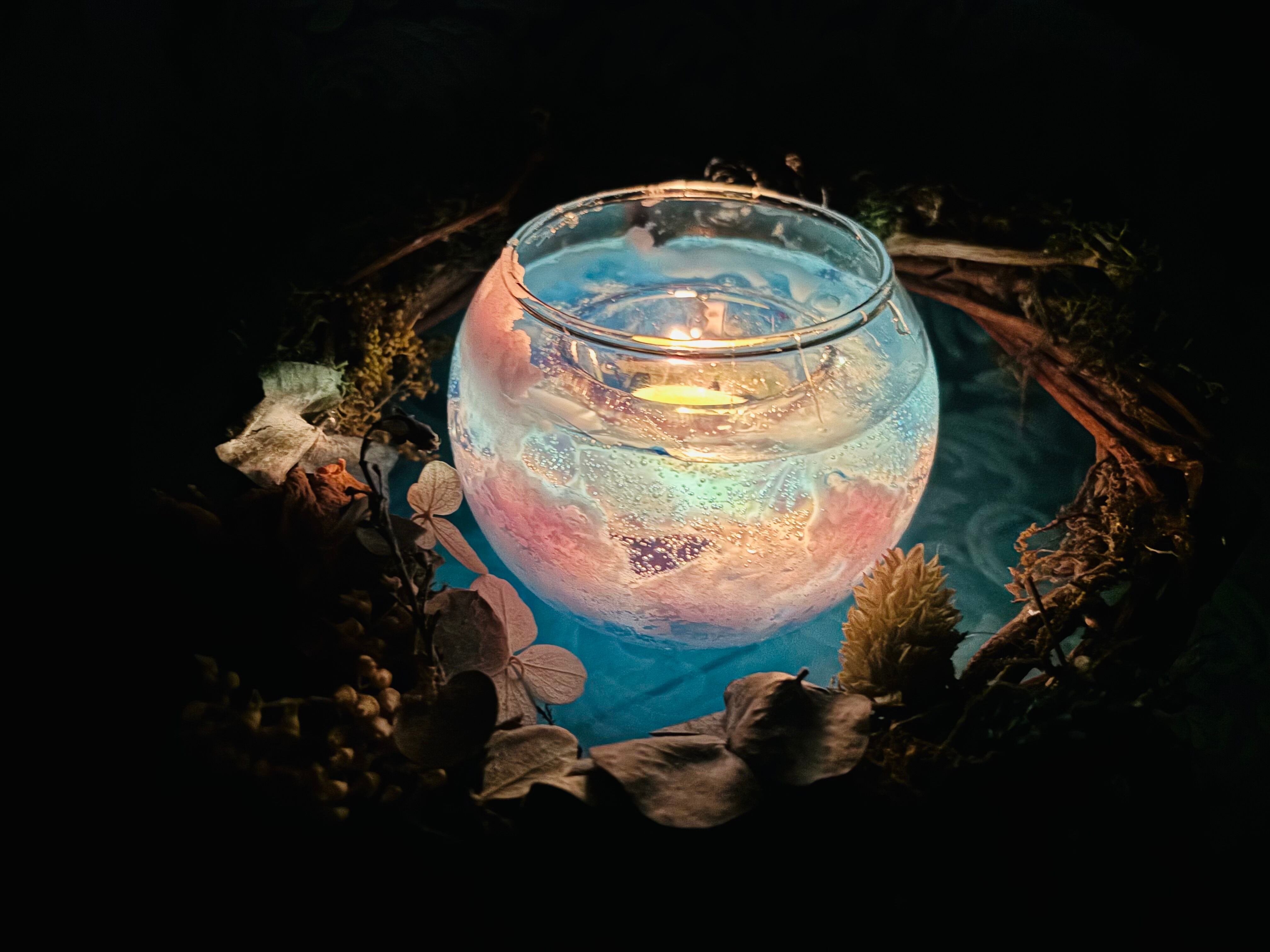 今回のキャンドルホルダーは雲が薄紫、グラデーションは王道の青空に少しだけホワイトが入って雲が溶けたような、部分もあるリアルな空をイメージしました。